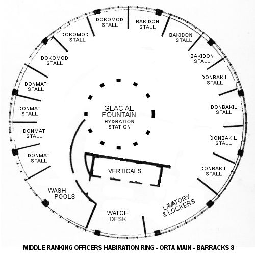 Orta contains barracks in the form of a ‘Habitation Ring.‘ In the Ring, an individual retains a partitioned space called a ‘Hole.’ Each Hole contains one round cushion, one box for boots and belts, and hooks for uniforms and blasters.